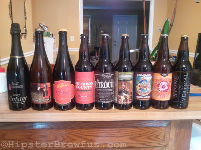 Actually, what the plan was, was to age some of my beers I have. It's something I've always been interested in trying, but never had the will power. I hit the interwebs and did some research to find out what I had in my fridge that would be a good candidate. I read that beers with a high ABV are great candidates, because the alcohol mellows out over time and other flavors kind of bloom. Also, hoppy beers are a no-go. More hop forward beers are something you want a bit more fresh. So I took those two basic rules and set to my fridge to find what would be going into my cellar. Here is what made the cut: